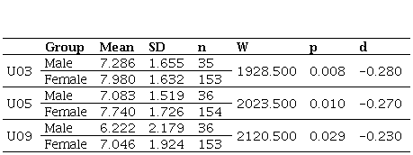 With regard to gender (see Table 5), significant differences were found in three items (U03, U05, and U09), with small effect sizes. In all cases, female students obtained higher mean scores than male students. These items refer to the usefulness of generalising content and applying it to real-life situations (U03), enhancing learning (U05), and increasing interest (U09), respectively. No significant differences were found in the average scores for the two dimensions.