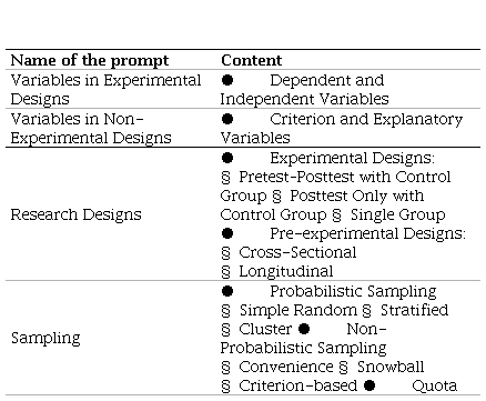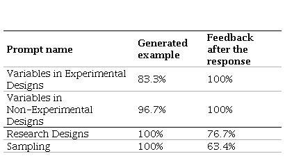 The following course content was included in the prompts: (1) types of research designs according to their experimental or non-experimental nature; (2) types of variables according to their role in the research design; and (3) types of sampling according to its probabilistic or non-probabilistic nature.