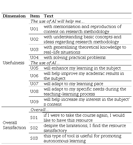 In contrast, indicators U03 and U04, related to the generalisation of content to real-life situations and the resolution of practical problems, received the highest scores in the dimension of usefulness.