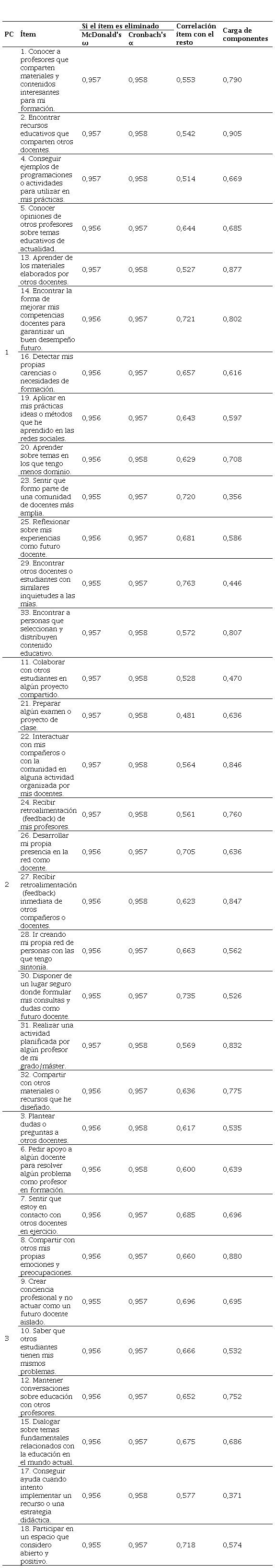 El primer factor, “Encontrar recursos y personas para aprender" (PC1), destaca la utilidad de las redes sociales para que los docentes en formación encuentren contenidos, recursos y materiales, así como para conectar con otros docentes. El segundo factor (PC2), “Aprendizaje académico”, se refiere al uso de las redes para preparar las asignaturas, interactuar, trabajar juntos, intercambiar dudas y recibir retroalimentación de los formadores, consolidando una red de aprendizaje. El tercer factor (PC3), “Apoyo mutuo”, incluye motivos que muestran cómo las redes sociales ofrecen espacios abiertos y positivos para evitar un posible aislamiento docente, dialogar, pedir apoyo y obtener ayuda.