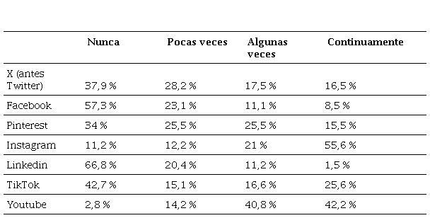 El primer objetivo de esta investigación era conocer si los docentes en formación utilizan las redes sociales y cuáles son las que utilizan y con qué frecuencia lo hacen. Los resultados evidencian que hay redes sociales que un alto porcentaje de los docentes en formación dicen no utilizar nunca, como Linkedin (66,8 %) y Facebook (57,3 %), seguidas de TikTok (42,7 %) y X (37,9 %) (Tabla 2). Instagram es la más utilizada por los docentes en formación (55,6 %), seguida de Youtube (42,2 %). Es destacable el caso de TikTok, que recibe una atención polarizada por parte de los encuestados. Un 42,7 % dice no hacer uso de ella nunca, pero, por el contrario, un 25,6 % hace uso de ella de forma continuada. Estas diferencias pueden venir determinadas por variaciones en la percepción de la utilidad educativa de TikTok. Sin duda, sugieren la necesidad de explorar cómo esta red social se ha integrado como recurso por algunos docentes en formación de forma que podamos maximizar su potencial educativo y abordar las preocupaciones que puedan generar resistencia.