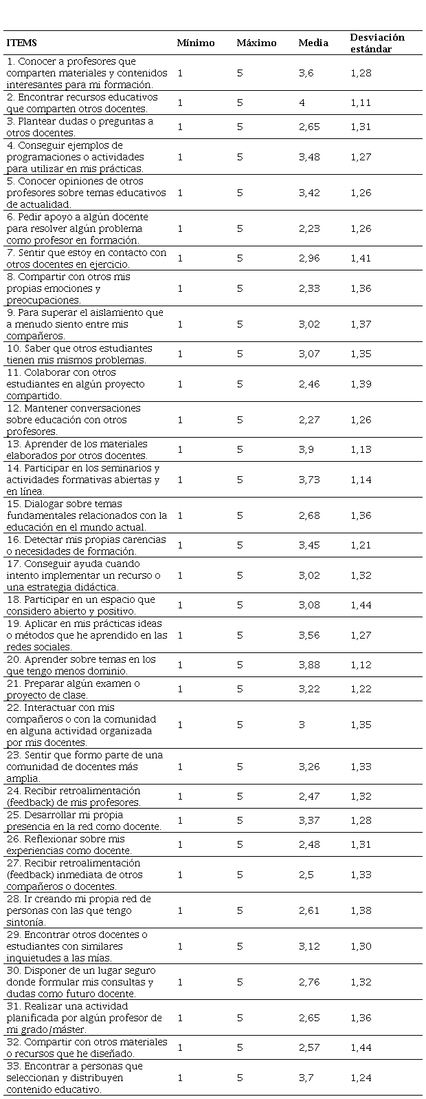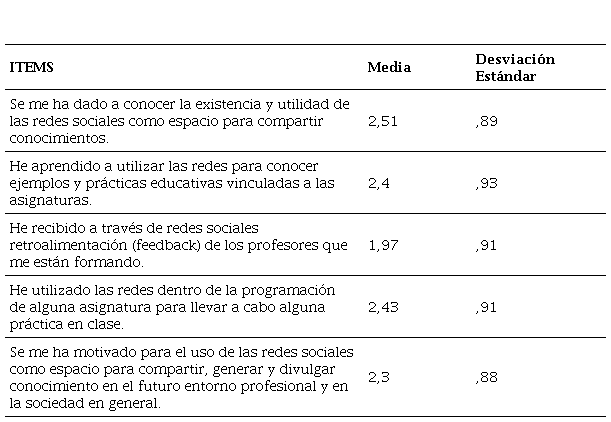 El cuestionario finaliza con una escala de 5 ítems que solicita a los encuestados que valoren, de 1 a 4 siendo 1 nunca y 4 continuamente, en qué medida el uso de redes sociales y su aplicación al ámbito educativo ha sido parte de su formación inicial docente.