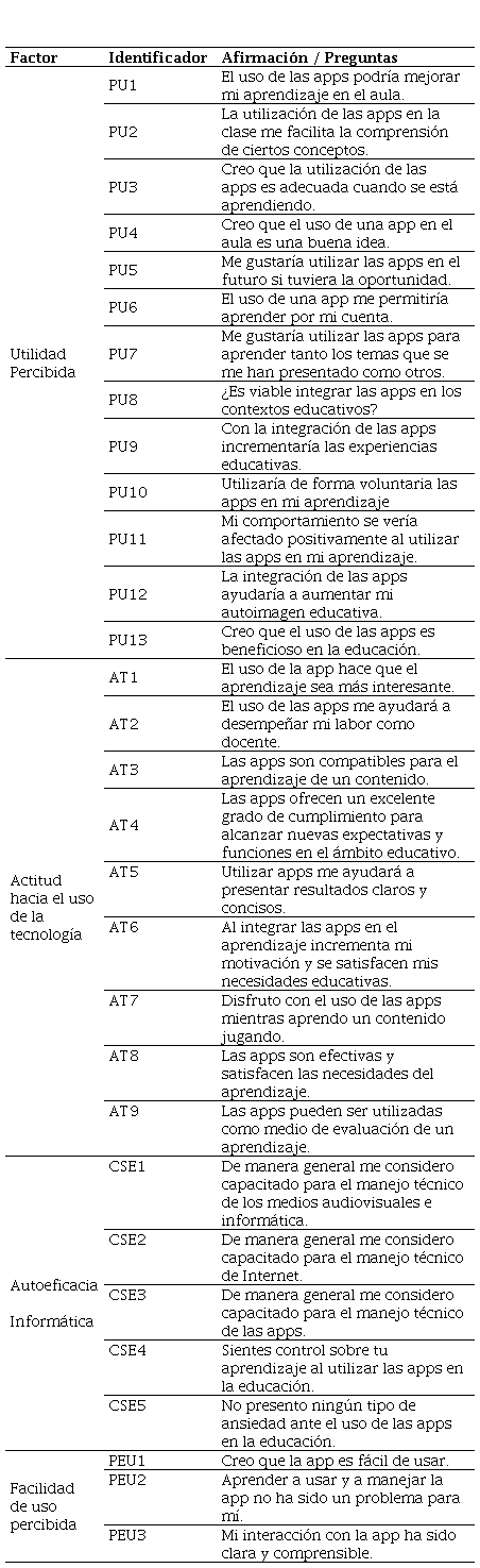 El instrumento fue diseñado a partir de las contribuciones del Modelo de Aceptación Tecnológica (TAM) propuestas por Davis (1989), Urquidi-Martín et al. (2019) y Ursavas (2022). Este modelo examina las diferentes versiones del TAM, incluidas todas sus versiones, siendo la última la que incorpora múltiples dimensiones para evaluar la aceptación de la tecnología. Sin embargo, se destacó que las actitudes, la usabilidad y las creencias de comportamiento son elementos útiles para comprender el uso de la tecnología. Además, se consideraron las retroalimentaciones sobre el uso de la tecnología basadas en el TAM de Ganjikhah et al. (2017), Cabero-Almenara y Pérez Diez de los Ríos (2018), Cabero-Almenara y Llorente-Cejudo (2020), Gutiérrez-Castillo et al. (2024) y Rodríguez-Sabiote et al. (2023). Por lo tanto, se adaptó el modelo TAM original con el objetivo de evaluar las percepciones de los estudiantes universitarios respecto a las aplicaciones móviles.
