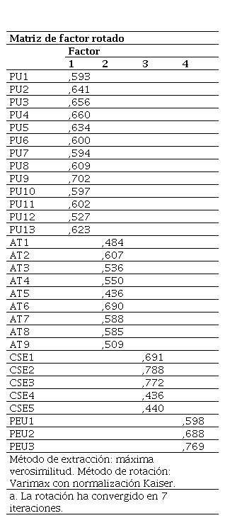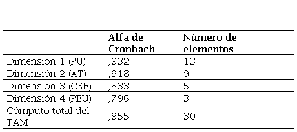El análisis de fiabilidad (Tabla 2) revela que la dimensión 1 (Percepción de Utilidad - PU) y la dimensión 2 (Actitud hacia la Tecnología - AT) muestran coeficientes de confiabilidad muy altos, indicando una consistencia notable entre los elementos que las componen. De manera similar, se observa que la dimensión 3 (Autoeficacia en el Uso - CSE) también exhibe un índice moderadamente alto de confiabilidad, lo que sugiere una coherencia interna en los datos recopilados. Sin embargo, la dimensión 4 (Facilidad de Uso Percibida - PEU) muestra una confiabilidad ligeramente menor que la dimensión 3, aunque aún se podría considerar moderadamente alta. Esto podría atribuirse a una menor coherencia entre los ítems que la componen. El coeficiente de alfa de Cronbach para las cuatro dimensiones es de 0,955, lo que indica una alta consistencia interna generalizada.