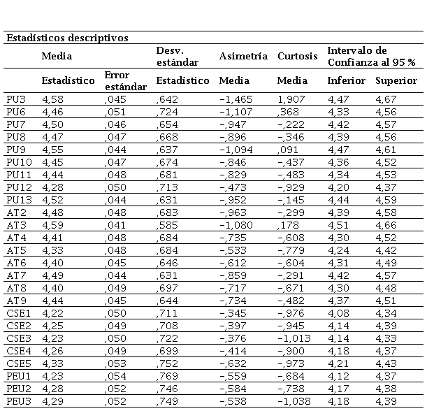 Para analizar la aceptación del uso de apps móviles en la educación, según las dimensiones estudiadas con el modelo TAM, se realizó un análisis descriptivo de los ítems del modelo confirmado, encabezado por 4 y 25 ítems. En la Tabla 4 se presenta: media, desviaciones típicas, coeficiente de asimetría, coeficiente de curtosis y el nivel de confianza de la media al 95 %.