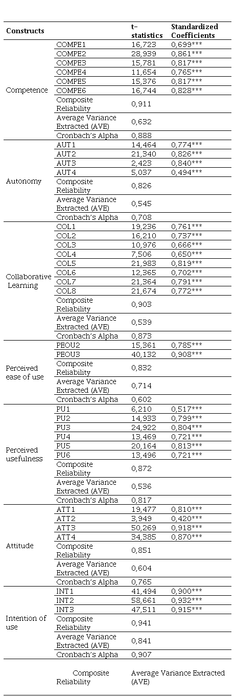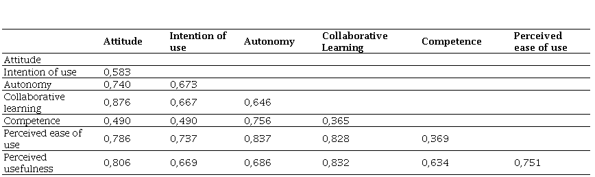 The p-values and statistics associated with the null hypothesis test of the regression coefficients or loadings, which are asymptotically distributed as a Student's t, are shown in Table 2. The criterion for accepting these tests requires that the t-values associated with the estimated parameters exceed 1.65/1.96/2.57 in absolute value (since the large sample size increases degrees of freedom, the t-distribution approximates a standard normal distribution N(0,1) for 90%/95%/99% significance levels). That is, a p-value less than 0.1/0.05/0.01 would indicate rejection of the null hypothesis that any of the measurement model coefficients are zero. All loadings exceed 0.55 (Falk & Miller, 1992) except for the loadings of the items AUT4 from Autonomy and ATT2 from Attitude. However, they are significant, and since they do not deviate much from the acceptance threshold (0.494 and 0.420, respectively) and do not interfere with convergent and discriminant validity (to be discussed later), the decision was made to retain the items in their construct to preserve the original meaning. Thus, individual reliability is confirmed. To test the reliability of the constructs, Cronbach's Alpha (Cronbach, 1951) is analyzed, and Composite Reliability (CR) is calculated, with an optimal value being equal to or greater than 0.7 for both indices (Nunnally, 1978). Only one construct has an Alpha lower than 0.7 (PEOU with Alpha 0.602) but given its proximity to the acceptance threshold and its valid CR and AVE, the reliability and convergent validity of the 7 constructs are considered achieved. For convergent validity, it is checked that the Average Variance Extracted (AVE), i.e., the degree to which a latent variable is explained by its observed variables, is greater than 0.5 (Hair et al., 2010). In Table 2, all CRs are greater than 0.7, and all AVEs are greater than 0.5, indicating that the reliability and convergent validity of the 7 constructs have been achieved.