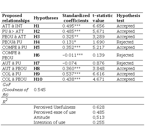 Structural models must meet minimum quality fit standards. One such criterion is that the model must exhibit sufficient explanatory power, meaning that the amount of variance in the exogenous variable explained by the constructs that predict it must be adequate. This is measured through the R2, which ranges from 0 to 100%. Falk and Miller (1992) indicate a 10% threshold as acceptable (R2 ≥ 1). In this model, all exogenous variables are adequately explained by their predictors as all R2 values are greater than 0.1, as shown in Table 4. Additionally, to assess the model fit, the global fit index (GoF) should be calculated (Tenenhaus et al., 2005; Tenenhaus & Vinzi, 2004). This index is calculated by multiplying the square root of the average AVE by the square root of the average R2. To confirm the reliability and fit of the model, the GoF should be ≥ 0.36 (Atker et al., 2011). In this case, the GoF is 0.545, which is above the acceptance threshold (Table 4). Table 4 also presents the values of the coefficients (β), the Student's t-statistic, and the statistical significance value obtained through Bootstrapping. In this case, 500 re-samples and a significance level of 5% (α = 0.05) were used. These values support H1, H2, H3, H5, H8, H9, and H10 since their coefficients are significant and greater than 0.3. According to Chin (1998), a causal relationship between two constructs in the model can be affirmed if the β value between them is greater than or equal to 0.2 and is also statistically significant. Hypotheses H4, H6, and H7 are not significant at the 5% level, although H4 is significant at the 10% level.
