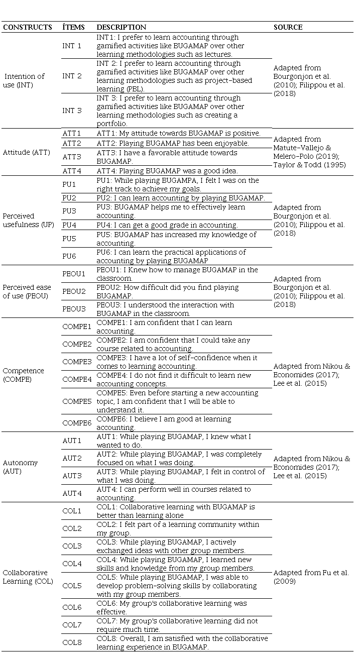 Abstract: In recent years, the academic literature suggests the need for innovative pedagogical approaches, especially in higher education, to improve the learning results of younger generations. In line with this, gamification, which combines intrinsic and extrinsic motivation, emerges as a tool with the potential to meet younger generations' expectations. Using the Self-Determination Theory and the Technology Acceptance Model this study focuses on analyzing factors affecting the acceptance of gamification by university students. The combination of these two theories has allowed the proposal and testing of an explanatory model using structural equation modeling to analyze causal relationships between constructs, providing a more robust and detailed understanding of the factors that influence the acceptance of gamification in the applied context. The results of the study suggest that collaborative learning enhances perceived ease of use, perceived usefulness, attitude, and intention to use. Additionally, perceived competence increases perceived usefulness, and autonomy improves ease of use. These findings provide valuable insights to the object of study due to the methodology employed and point out the importance of understanding factors affecting gamification acceptance. Understanding these factors will enable educators and game developers to design more effective strategies when using gamification not only in accounting education but in other higher education disciplines.