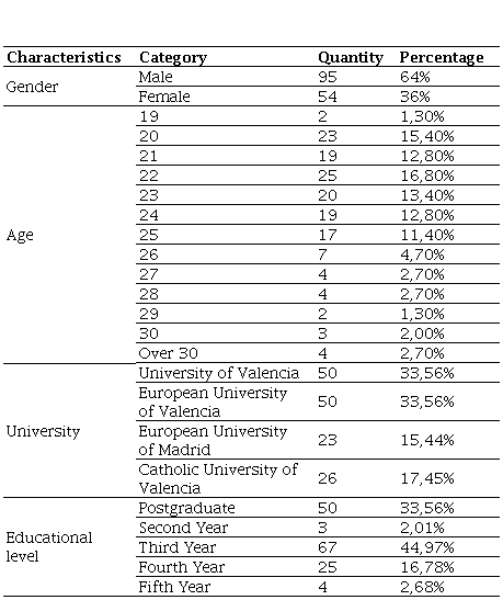 The study sample consisted of 149 undergraduate and postgraduate students from four Spanish universities. The intervention was conducted in various classrooms within each university. To select participants, an initial contact was made with instructors of accounting-related subjects, who then introduced the activity to their students. Students were randomly selected on the condition that they were enrolled in, or had completed, second-level or higher accounting courses. Additionally, all students participated voluntarily and signed an informed consent form at the beginning of the activity.