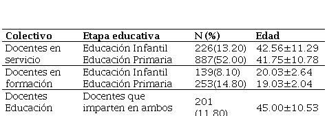 Diseño y Participantes: Este estudio adoptó un enfoque no experimental (ex post facto) de diseño transversal. La recolección de los datos fue a través de un muestreo no aleatorio de manera intencionada. Los datos fueron recolectados durante el año 2023 y 2024. Los autores se pusieron en contacto con los docentes en ejercicio mediante correo electrónico y también durante clases presenciales con docentes en formación, facilitándoles un enlace para completar una encuesta. Se aseguraron de garantizar la confidencialidad y privacidad de los datos. La muestra total fue de 1706 participantes, clasificados según se observa la distribución de la Tabla 1.