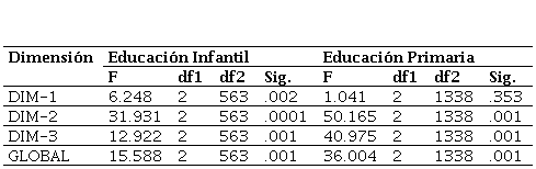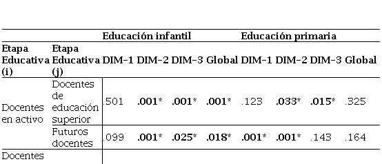 Para la etapa de Educación Infantil es observado en la Figura 1 que las autopercepciones son medio-altas en los tres colectivos docentes para las DIM-1 y DIM-2, mientras que son muy bajas en la DIM-3. Específicamente, para la dimensión habilidades digitales para buscar y seleccionar información a través de videos educativos (DIM-1), se observan puntuaciones favorables y medio-altas, cuyo colectivo con mayor autopercepción son los docentes de Educación Superior (M=5.29), seguido de los docentes en activo (M=5.10) y con puntuaciones inferiores los futuros docentes (M=4.76). El modelo ANOVA para el factor DIM-1 fue significativo, F(2, 563) =5.478, p<.05, n2=.019, interpretándose como diferencias significativas entre los colectivos docentes. Específicamente, en las comparaciones múltiples fueron encontradas diferencias significativas entre los docentes de educación superior y los futuros docentes (p=.003). Respecto a la DIM-2, las autopercepciones de ambos colectivos docentes son altas, con mayor puntuación el grupo de futuros docentes (M=6.20), seguido de los docentes de Educación Superior (M=5.83) y finalizando con el grupo de docentes en activo (M=5.13). El modelo de ANOVA para el factor DIM-2 fue significativo, F(2, 563)=21.609, p<.05, n2=.071; donde diferencias significativas fueron halladas entre los docentes en activo y los futuros docentes (p=.001), así como entre los docentes en activo y los docentes de Educación Superior (p=.001). Respecto a la DIM-3, se observa puntuaciones bajas para los tres colectivos docentes. Específicamente, los docentes de Educación Superior son los que poseyeron unas autopercepciones superiores (M=3.92), seguido de los futuros docentes (M=3.49), y por último, los docentes en activo (M=2.98). El modelo de ANOVA para el factor DIM-3 fue significativo, F(2, 563)=14.943, p<.05, n2=.050, por lo que diferencias significativas existían en las autopercepciones de los grupos docentes. En el test de comparaciones múltiples, fueron halladas diferencias significativas entre los docentes en activo y los futuros docentes (p=.025), así como los docentes en activo y los docentes de Educación Superior (p=.001). Para el global, el modelo fue significativo, F(2, 563)=10.627, p<.05, n2=.036. Concretamente, diferencias significativas existían entre los docentes en activo y los docentes en formación (p=.018), así como los docentes en activo y los docentes de Educación Superior (p=.001). En la Tabla 4 se observa con mayor claridad las comparaciones múltiples realizadas.