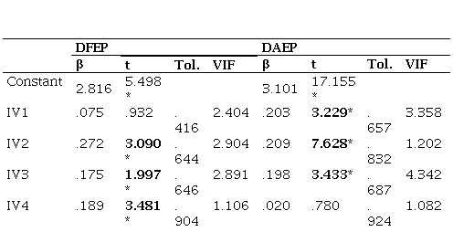 Se comprobó los supuestos que permiten llevar a cabo este tipo de técnica estadística. Los diagnósticos de colinealidad obtenidos a partir de técnicas multivariantes de Tolerancia (TOL) y VIF que se observan en las tablas 7 y 8 indican que las variables predictoras no presentan posibles problemas de colinealidad, ya que los valores de TOL son mayores a 0.6 y los valores de VIF están por debajo de los valores de 10 (Chan, 2004). Por otro lado, la independencia de los residuos (Durbin-Watson) fue satisfactoria con valores en el umbral de 1,5-2,5. Los valores encontrados para estos colectivos fueron: futuros docentes Educación Infantil (DW=2.078), futuros docentes Educación Primaria (DW=1.978); docentes Educación Superior (DW=1.804); docentes en activo Educación Infantil (DW=1.668), docentes en activo Educación Primaria (DW=1.525).