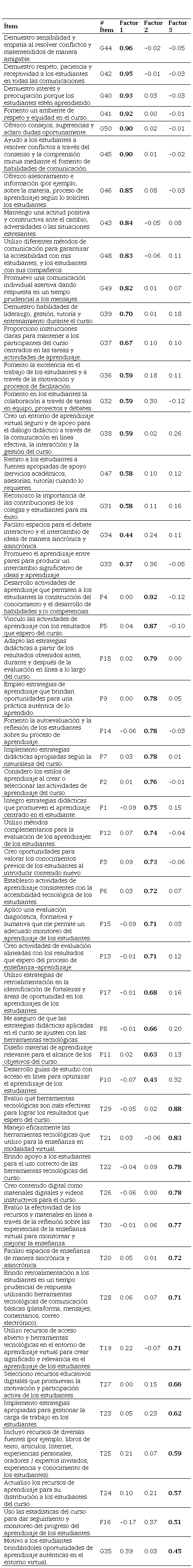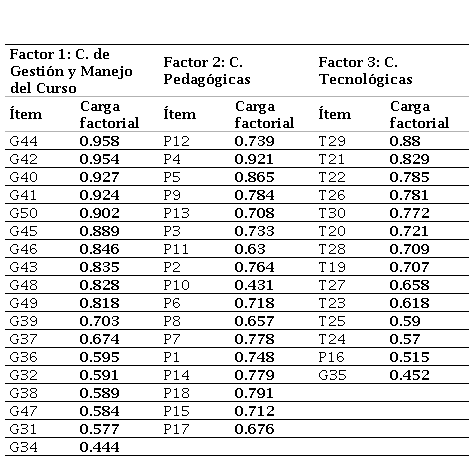 Al aplicar el método de extracción y de rotación, todos los ítems cargaron al factor para el cual habían sido diseñados teórica y empíricamente exceptuando únicamente dos. Sin embargo, las dimensiones cambiaron su orden de conformación del constructo. Los resultados sugieren que el primer factor que conforma el constructo «competencias en enseñanza virtual» es la dimensión Competencias de gestión y manejo del curso, el segundo es el referido a las competencias pedagógicas y el tercero, las competencias tecnológicas. La Tabla 2 presenta las cargas factoriales estandarizadas de los ítems de la escala para los tres distintos factores según el AFE.
