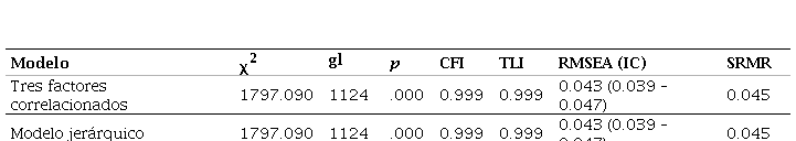 Los resultados evidenciaron que, tanto el modelo de tres factores correlacionados como el modelo jerárquico satisfacen los criterios de aceptación con relación a los índices de ajuste descriptivos e inferenciales. No obstante, ambos modelos develaron valores invariantes, como se muestra en la Tabla 5. El modelo unidimensional también satisfizo los criterios de aceptación, pero para este modelo, los índices de ajuste CFI y TLI estuvieron sutilmente por debajo de los obtenidos por sus predecesores. Los índices de ajuste SRMR y RMSEA para este modelo superaron los valores propuestos por Abad et al. (2011): 0.082 > 0.08 y 0.111 > 0.06 correspondientemente, sugiriendo, por consiguiente, que el modelo no se ajusta. La Tabla 5 muestra los índices de ajuste de los modelos examinados.