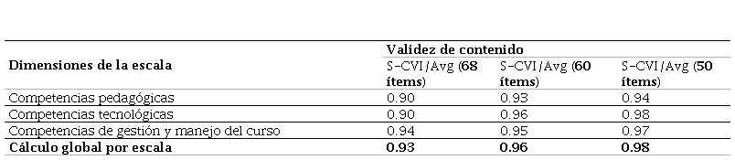 La versión preliminar del banco de ítems (68) alcanzó un IVC aceptable, pero 8 de ellos no alcanzaron el valor límite a nivel de ítem. Estos se descartaron y el conjunto restante (60) fue sometido nuevamente a análisis obteniendo valores superiores. No obstante, uno de los juicios cualitativos frecuentes entre los expertos era la sugerencia de eliminar o unificar algunos ítems cuya esencia tendía a indicar similitud. En consecuencia, se eliminaron 6 ítems y unificaron 8 y, por ende, el conjunto de ítems se redujo a 50. Los resultados sugieren que el contenido de los ítems de la versión final de la ECODEV evidencia una excelente y satisfactoria validez (Polit et al., 2007, como se citó en Yusoff, 2019), como se observa en la Tabla 1. Los resultados y comparaciones entre las tres versiones se detallan en esta misma.
