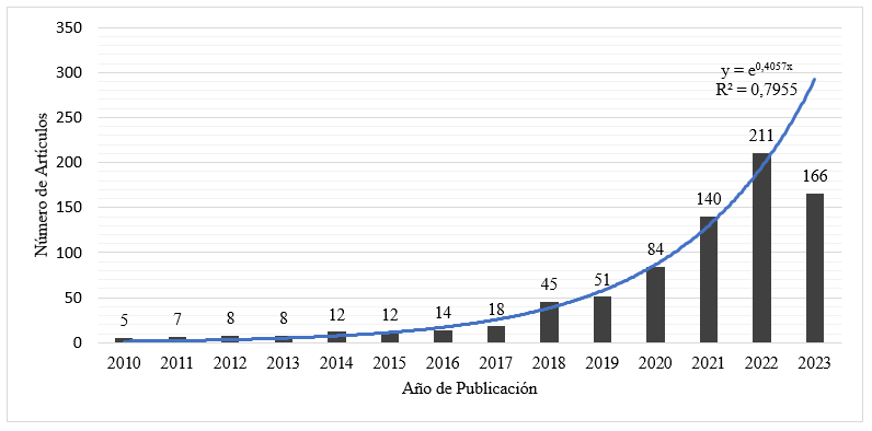 Se seleccionaron un total de 781 artículos de la base de conocimientos, y se distribuyeron cronológicamente entre 2010 y 2023, como se muestra en la Figura 3. Es factible hacer suposiciones preliminares de que la investigación relevante sobre las interacciones de la educación superior aplicando aprendizaje online en los estudiantes graduados, cuyo volumen ha ido aumentando desde 2020 a la fecha. El pico de publicaciones relevantes se produjo en 2022 con 211 artículos, seguido de 2021 con 140 artículos. Es importante señalar que los artículos publicados en 2023 se recuperaron en el tercer trimestre del año, por lo que el número total de artículos para este período en particular está incompleto. Es posible concluir que desde el año 2018 se ha producido un constante desarrollo de investigaciones relevantes sobre las interacciones de estos conceptos, y desde el 2020 creció exponencialmente debido a la pandemia Covid-19.
