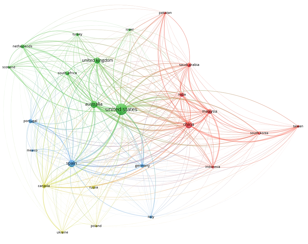 El presente estudio se propuso localizar los principales centros de investigación a nivel mundial. Los resultados indicaron que Estados Unidos lidera el ranking, seguido de Australia, España y China. Este tipo de análisis permite discernir los países más prolíficos en las áreas estudiadas y establecer vínculos entre instituciones, lo que sienta las bases para futuras investigaciones que identifiquen nuevos actores y evalúen los logros académicos alcanzados.