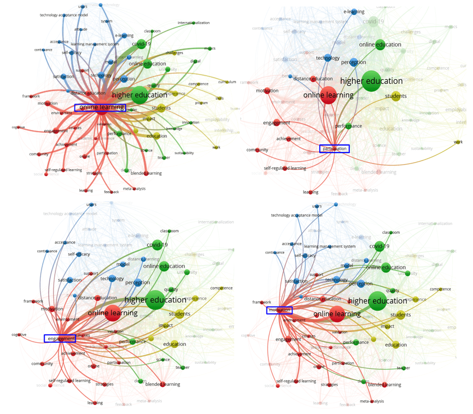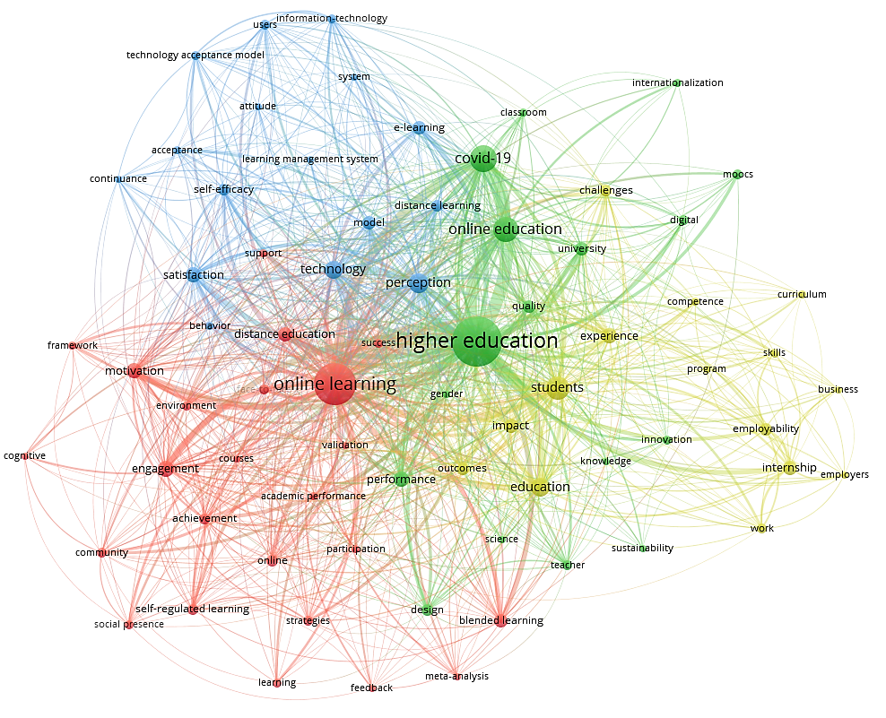Abstract: With the rise of online education, universities are seeking to optimize the experience of distance learners. To do so, it is crucial to develop key competencies in future professionals, such as transferable skills, emotional regulation, professional development, self-management, and self-efficacy. Understanding the impact of the online environment on engagement is critical for the successful implementation of online programs. This article presents a systematic literature review and bibliometric analysis of 781 articles, exploring trends in publications, high-impact journals, countries, institutions, and keyword analysis with VOSviewer. The current state of the art and the latest educational trends to boost online learning are analyzed. Finally, a model is proposed that integrates the main concepts of the VOSviewer co-occurrence map in the context of online learning in higher education for graduate students. This framework offers a concrete representation for integrating online learning tools and technologies in higher education. Furthermore, this framework will be instrumental in understanding the skills needed in online education, especially critical reflection and professional competencies. It combines innovative theoretical concepts and offers a promising vision for the future of education. While e-learning has great potential, its limitations need to be addressed and efforts made to ensure that all students have equal opportunities for development in this ever-changing educational environment.