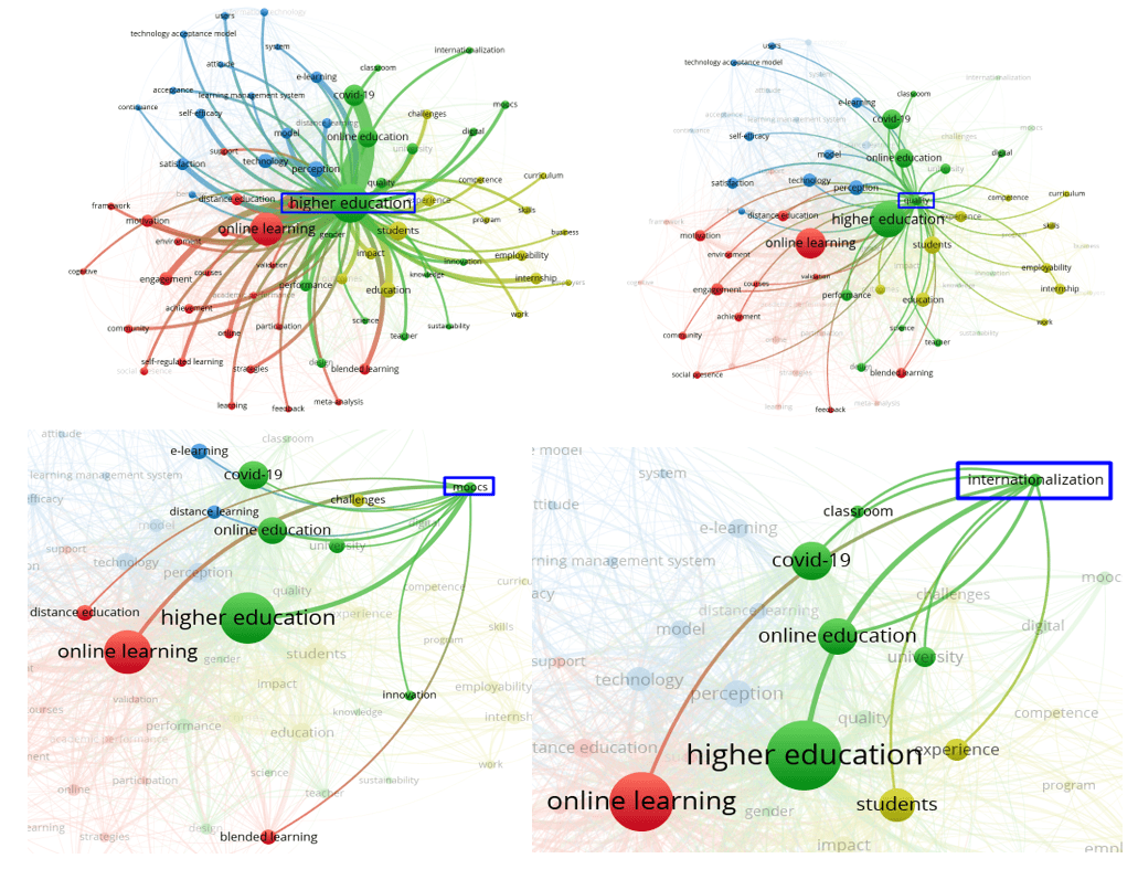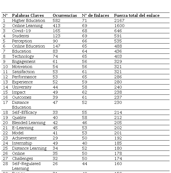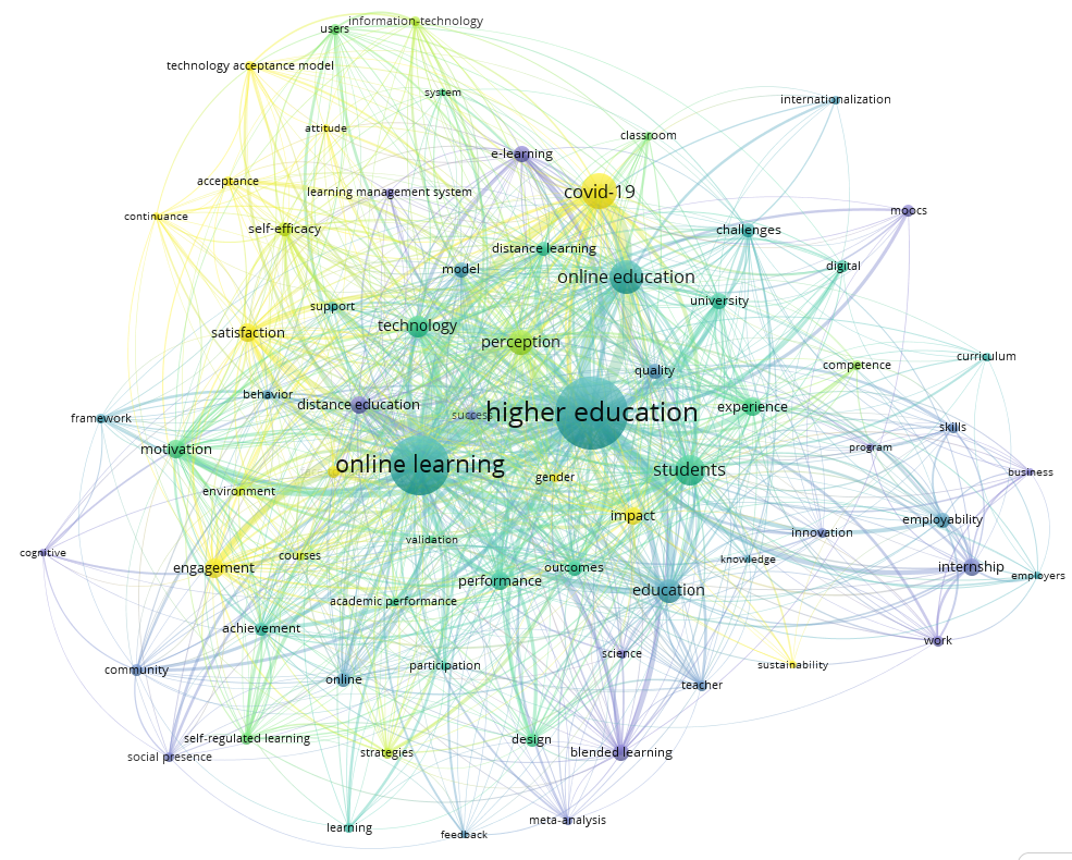 Se destaca que, en el último año, 2022, han surgido conceptos como “Technology Acceptance Model (Modelo de Aceptación de Tecnología)”, “Engagement (compromiso)”, “Self-efficacy (autoeficacia)”, “impact (impacto)” conceptos que impulsan el estudio significativo del aprendizaje online en la educación superior. Estos conceptos se consideran esenciales como indicadores para una educación online de calidad.