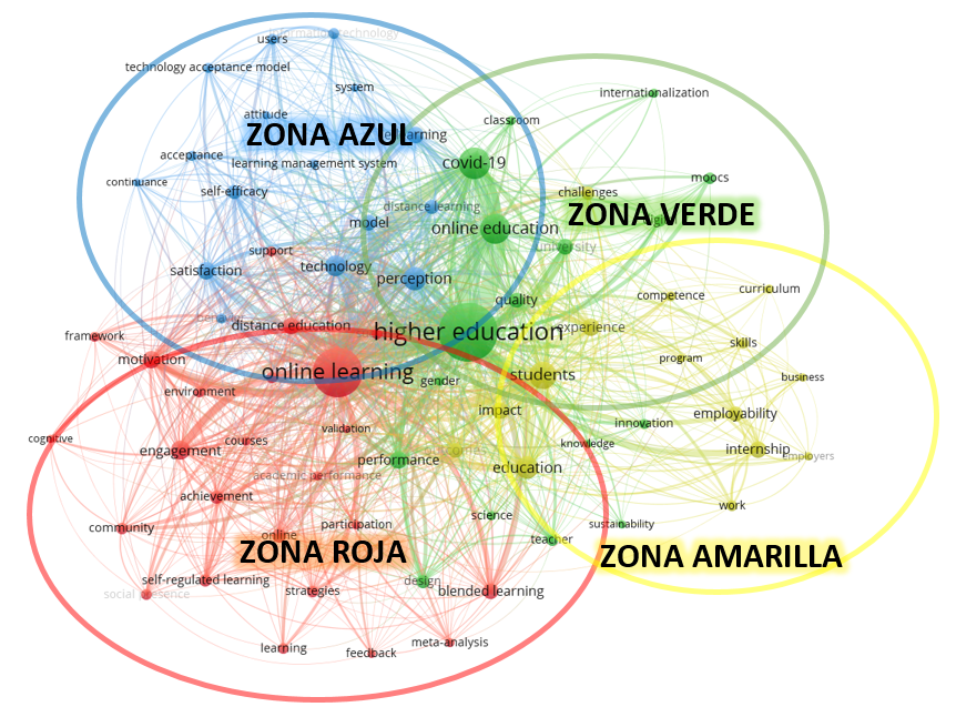 Las siguientes Zonas son: (1) percepción y satisfacción del aprendizaje a distancia haciendo uso de tecnologías (Zona Azul); (2) Mantener el compromiso, la participación, la motivación y el ambiente del curso usando aprendizaje online (Zona Roja); (3) Habilidades y competencias de los futuros profesionales (Zona Amarilla); (4) Educación Online de calidad en la educación superior: camino hacia la internalización a través de cursos en línea masivos y abiertos (MOOC) (Zona Verde).