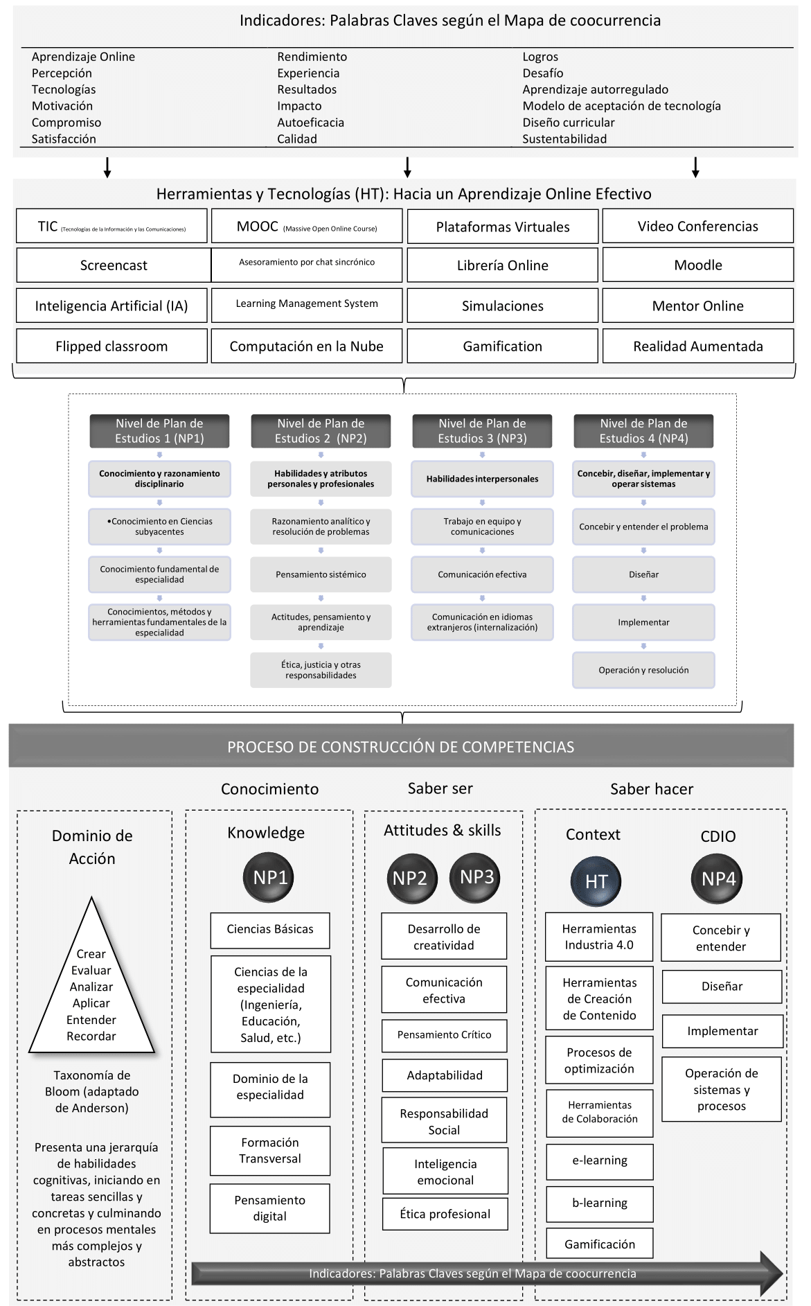 Teniendo en cuenta estos hallazgos anteriores, el estudio actual presenta un flujo para la construcción de un marco de competencias integrando los requerimientos y necesidades del aprendizaje online y sus principales herramientas y tecnologías, adaptando la estructura tradicional para la generación de competencias educativas.