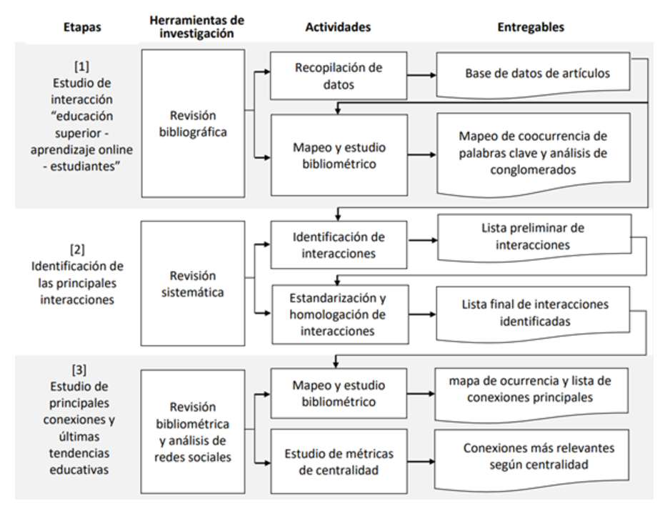 En este sentido, a través de la revisión bibliográfica realizada se analizaron las principales métricas de las publicaciones enlazadas, así como el análisis y discusión a través de una revisión manual de las variables que inciden en el aprendizaje online en la educación superior para estudiantes graduados. La investigación se divide en tres etapas principales: (1) estudio de la interacción en “educación superior - aprendizaje online - estudiantes graduados”, (2) identificación de las principales interacciones en la literatura, y (3) estudio de las principales conexiones y últimas tendencias. La Figura 1 presenta las herramientas, actividades y entregables para cada una de las etapas abordadas en esta investigación.