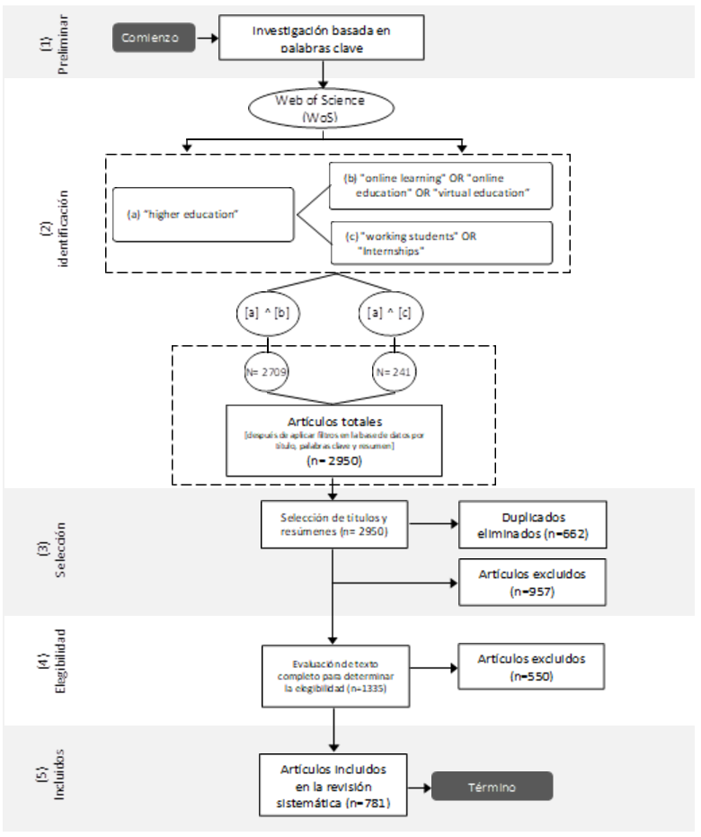 Criterios de inclusión y exclusión. La búsqueda de artículos se centró en los temas “educación superior - aprendizaje online - estudiantes graduados”. Para refinar los resultados, se aplicaron los siguientes criterios de inclusión: (1) artículos relacionados con la educación superior universitaria, excluyendo la educación preescolar, básica y media; (2) artículos pertenecientes al ámbito de la educación. Se descartaron artículos relacionados con otras áreas (por ejemplo: turismo, manufactura, sector automotriz, etc.), y aquellos publicados antes del año 2010.