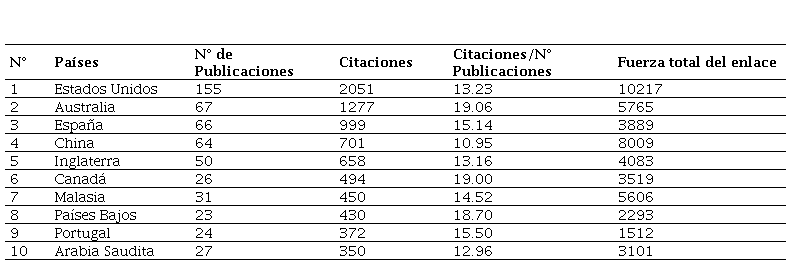 En la Tabla 1 se enumeran los diez países más productivos, y según los resultados obtenidos, se generaron 44 países o territorios diferentes. Estados Unidos es el país más productivo en estudios relevantes sobre interacciones “educación superior aplicando aprendizaje online en los estudiantes graduados” con 155 publicaciones, seguido del Australia con 67 publicaciones. En tercer lugar, se encuentra España con 66 publicaciones, seguida de China con 64 publicaciones.