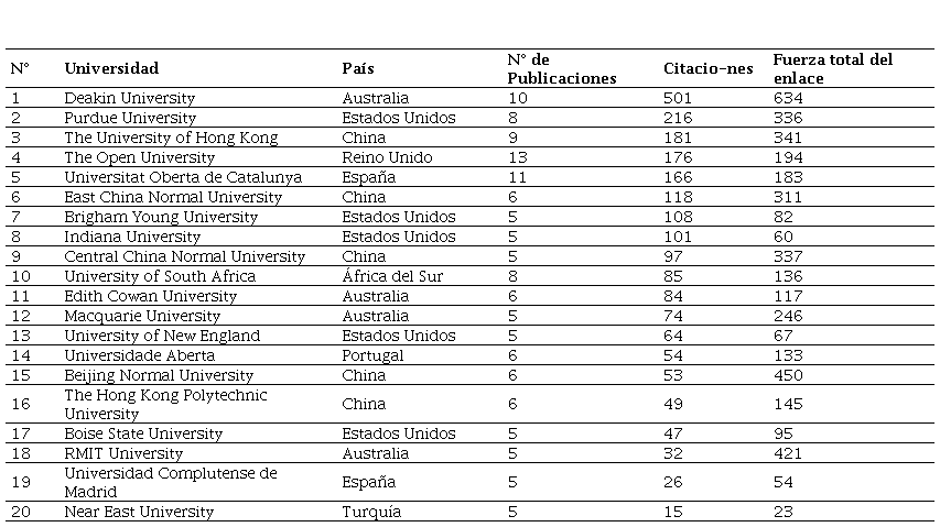 La universidad con más citaciones es la Deakin University (n= 501), seguida de Purdue University (n= 216), The University of Hong Kong (n= 181) y The Open University (n= 176). El análisis refleja que los esfuerzos de investigación en educación superior aplicando aprendizaje online han sido aportados por diversas instituciones a nivel mundial.