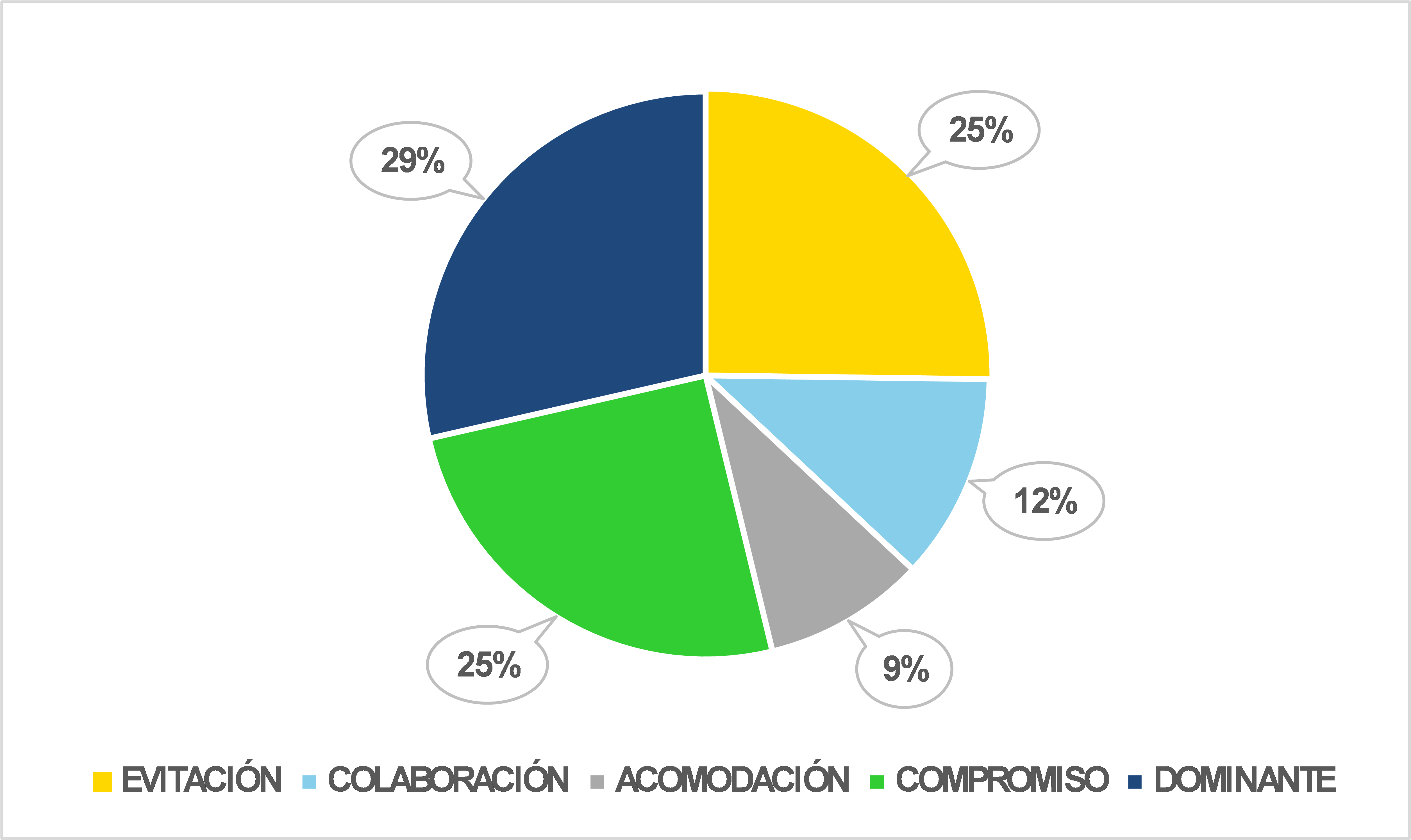 Los resultados globales indican que, en general, los participantes implementaron principalmente las estrategias de Dominación (29 %) y Compromiso (25 %), caracterizadas como más asertivas. Llama la atención el elevado registro de la estrategia de Evitación (25 %), así como la baja frecuencia de la implementación de la Colaboración (12 %), encontrada solo en 14 casos de las 117 experiencias codificadas.
