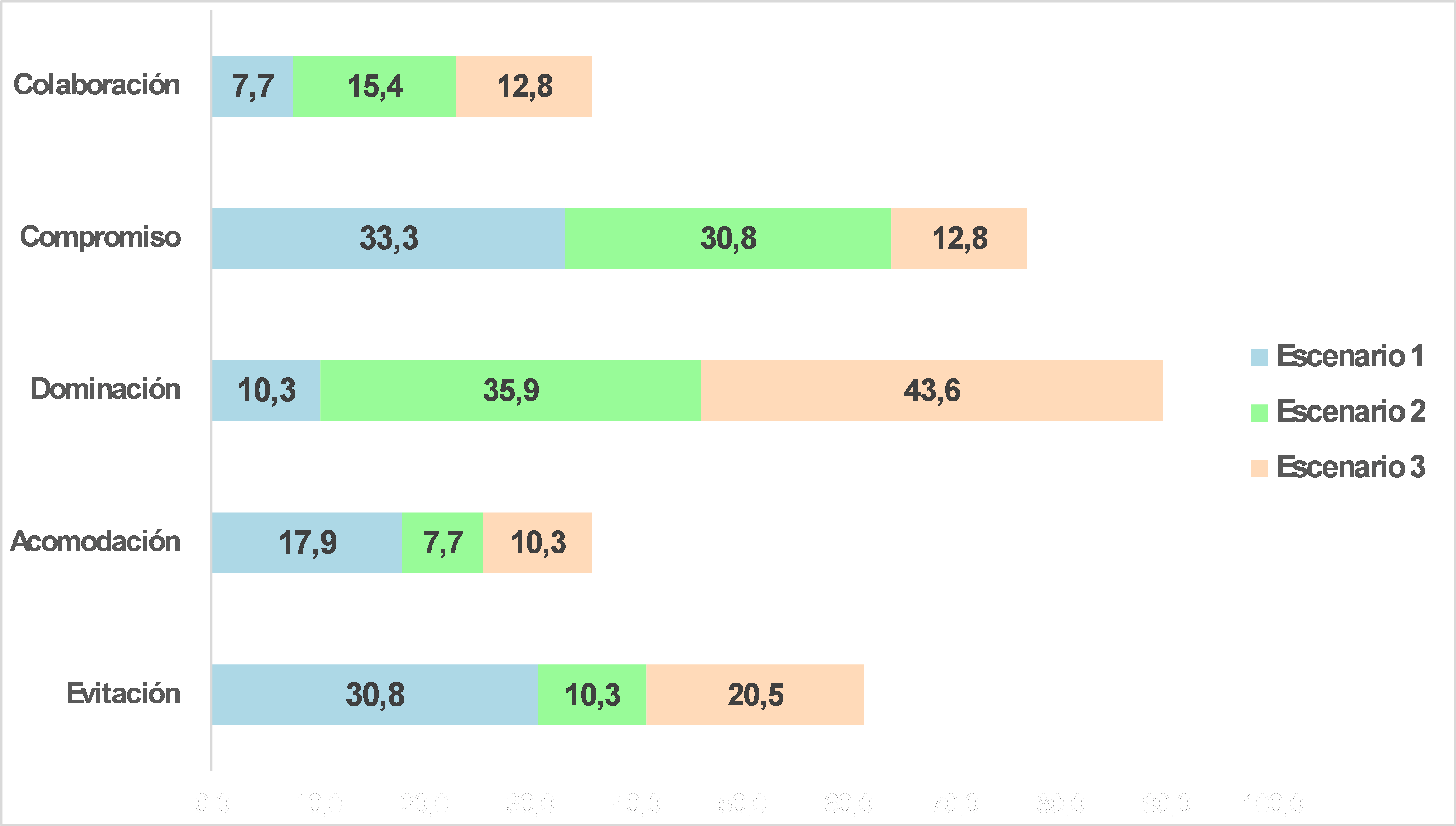 En el tercer escenario, la estrategia de Dominación fue más evidente. Los participantes adoptaron una postura más autoritaria y enfocada en imponer su voluntad. En la Figura 2 se presentan los detalles de este análisis.