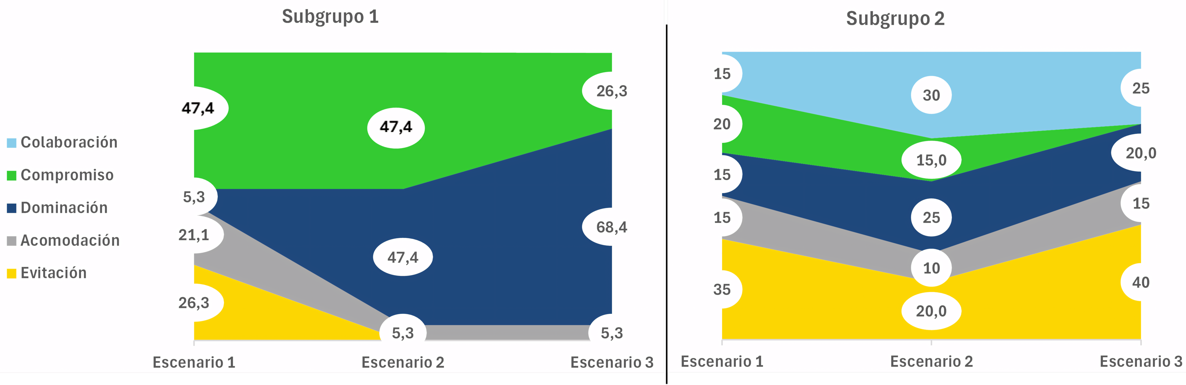 En el segundo escenario, este patrón se intensifica, con el subgrupo 1 adoptando estrategias más asertivas, como la Dominación y el Compromiso. En contraste, los participantes del subgrupo 2 usaron más la Colaboración, una estrategia no implementada por el subgrupo 1 en toda la experiencia. La estrategia de Evitación estuvo presente de manera destacada en el primer escenario para ambos subgrupos. Sin embargo, su frecuencia de implementación es mayor en los escenarios posteriores entre los participantes del subgrupo 2 (E1: 33.3, E2: 19.0 %, E3: 42.9 %), mientras que ningún participante del subgrupo 1 la utilizó en los últimos escenarios. Además, no se evidenciaron cambios destacables en el uso de la estrategia de Acomodación, empleada menos frecuentemente durante la experiencia.