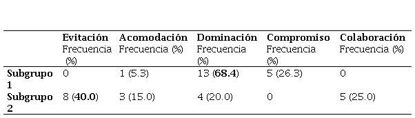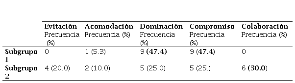 El análisis de conglomerados permitió identificar dos perfiles distintivos entre los participantes. El primer grupo (subgrupo 1, n=19, 48.7 %) se caracterizó por ser predominantemente asertivo, pero no cooperativo, mostrando una alta frecuencia en la aplicación de estrategias de afrontamiento reactivo, especialmente de Dominación y/o Compromiso. Por otro lado, el segundo perfil (subgrupo 2, n=20, 51.3 %) agrupó a participantes que emplearon estrategias con baja asertividad y moderada cooperación, siendo más comunes la Acomodación y la Evitación que en el subgrupo 1.