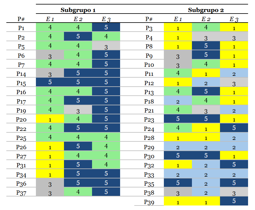 En el tercer escenario (conflictos durante el trabajo en grupo) el subgrupo 1 muestra un mayor porcentaje de implementación de la estrategia de Dominación en comparación con el subgrupo 2 (68.4 % y 20 %, respectivamente). Además, ninguno de los participantes del subgrupo 1 evitó gestionar el conflicto, mientras que los del subgrupo 2 optaron mayormente por la Evitación (consultar detalles en la Tabla 3).