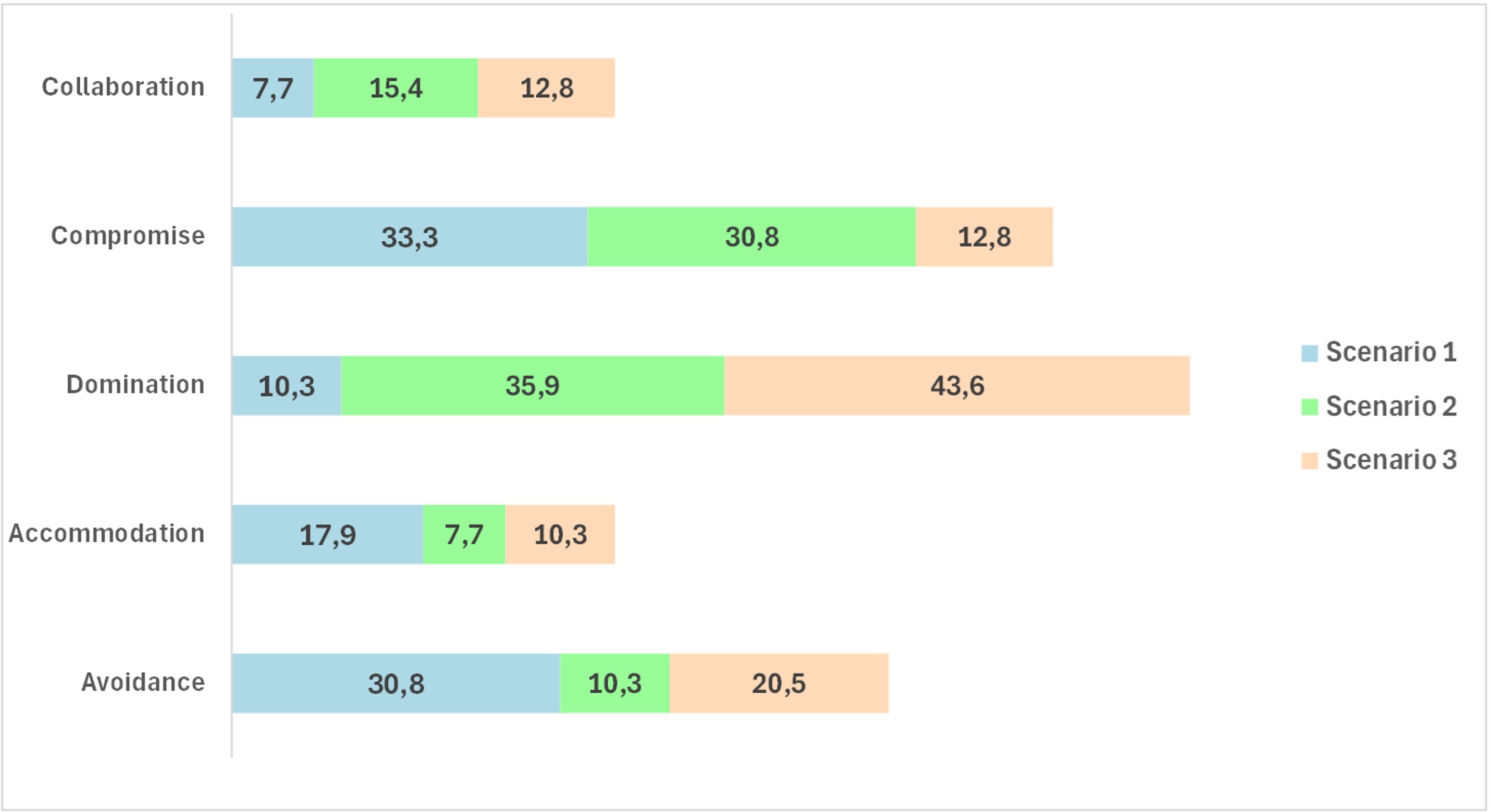 In the first scenario, Compromise and Avoidance strategies were predominant. Participants showed an active approach to problem solving, although some participants were also observed to avoid conflict situations.