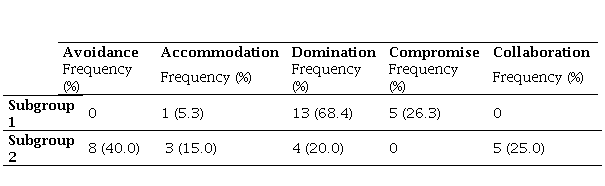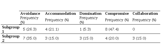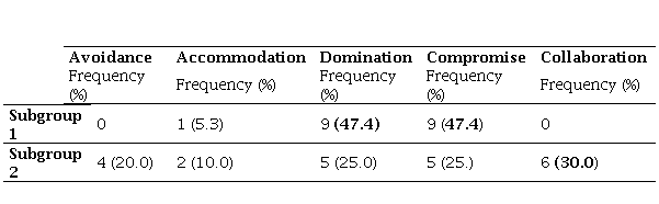 The cluster analysis allowed us to identify two distinctive profiles among the participants. The first group (subgroup 1, n=19, 48.7%) was characterised as predominantly assertive, but not cooperative, showing a high frequency in the application of reactive coping strategies, especially Domination and/or Compromise. On the other hand, the second profile (subgroup 2, n=20, 51.3%) grouped participants who employed strategies with low assertiveness and moderate cooperation, with Accommodation and Avoidance being more common than in subgroup 1.