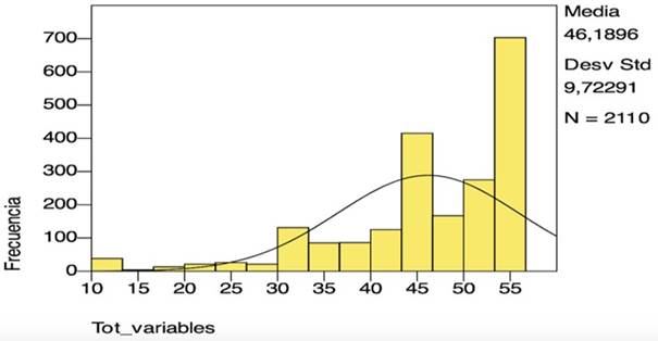 The normality test was performed with the Kolmogorov-Smirnov (K-S) test to evaluate the distribution of the data and verify if they follow a normal distribution (Tapia & Cevallos, 2021), presented in Table 2 and Figure 1 because N = 2110, with a reliability of 95% so (α = 0.05). For the test, the following hypotheses are established: