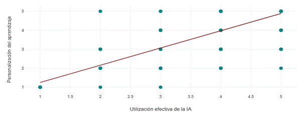 The high relationship between the effective use of Artificial Intelligence and the personalization of learning suggests that technology can tailor content to individual needs, improving student engagement (H1) with learning (Bond, et al., 2020). The data revealed a strong correlation of 0.88, which supports the idea that an educated implementation of AI provides adaptability in individualized learning processes; the more effective the use of AI, the more personalized the experience. However, difficulties in its implementation are also evident, indicating that adjustments are required to maximize clarity and personalization (H3).