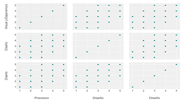 The correlation analysis of these three variables: "visual design and user experience," "ease of use and accessibility," and "content accuracy and relevance," reveals that visual design and user experience have a strong positive relationship with ease of use and accessibility (0.73), indicating that an improvement in these aspects tends to make the tools easier to use and more accessible. The correlation with content accuracy and relevance is moderate (0.68), indicating that good visual design also contributes to a better perception of the narrative, although not as much as ease of use. On the other hand, ease of use and accessibility show a moderate correlation with content accuracy and relevance (0.67), indicating that, although they influence the perception of content, their impact is minor compared to visual design. These results highlight that visual design and user experience are the most determinant factors for a good overall perception of AI-based educational tools, as indicated in Figure 4.