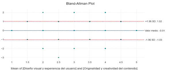 The evaluation of the originality and creativity of the narrative generated by AI shows a variety of perceptions among the different narratives, reflecting significant differences in the appreciation of the innovation and creativity of the content provided. To deepen this assessment, the Bland-Altman Diagram (BAD) is used to analyze the concordance between the perceptions of originality and creativity among the different narratives created. This diagram illustrates the relationship between the means of the originality and creativity scores and their respective standard deviations (SD). Overall, the narratives created by A01 and A06 have high originality and creativity scores, with means of (MV 4.14, SD 0.85) and (MV 4.48, SD 0.85) respectively. These creations offer innovative and creative content and are positively perceived by the participants. The BAD reveals that the low SD in A06 suggests a uniform perception of creativity among participants, while in A01, the deviation is somewhat higher, indicating a slight variability in perception. Groups A09 and A10 also have outstanding scores (MV 4.32, SD 0.83) and (MV 4.28, SD 0.85), respectively. These results show a high valuation of originality and creativity of content, although the DT is somewhat higher, suggesting some diversity in the perception of content creativity. The BAD confirms that the variability in perception is higher in these groups, compared to A06, but still within an acceptable range.
