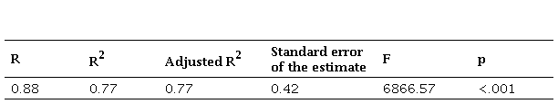 The correlation coefficient (R = 0.88) indicates a strong relationship between (X) and (M). The coefficient of determination (R^2 = 0.77) shows that 77% of the variability in effective AI utilization (M) can be explained by interactivity and feedback (X). The regression coefficient of X on M is 0.87 (B=0.87), and the standardized coefficient (Beta = 0.88), meaning that an additional unit in interactivity and feedback increases effective AI utilization by 0.87 pc. A standard error of the estimate of 0.42 reflects the accuracy of the model predictions. The F-value of 6866.57 and a p < .001 confirm that the model is highly significant and that the relationship between X and M is statistically robust.