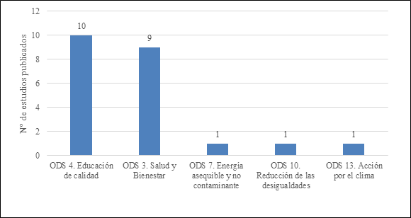 Para ello, de los 42 artículos científicos, en WoS se han identificado 21 artículos con el registro del ODS al que está asociado. En la Figura 4 se muestra un resumen del total de artículos asociados a cada ODS.