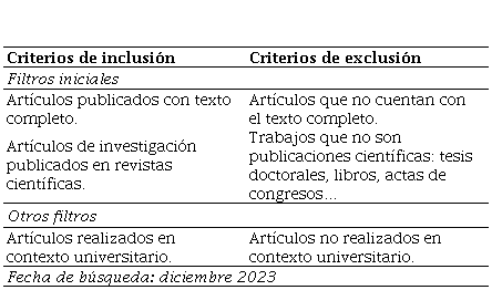 En la Tabla 1, se muestran los criterios de selección utilizados para la identificación de los estudios que formarán parte de la revisión sistemática.
