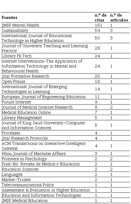 En la Tabla 2 se muestran las fuentes que han recibido al menos 1 cita en relación con el número de artículos asociados a cada una de ellas.
