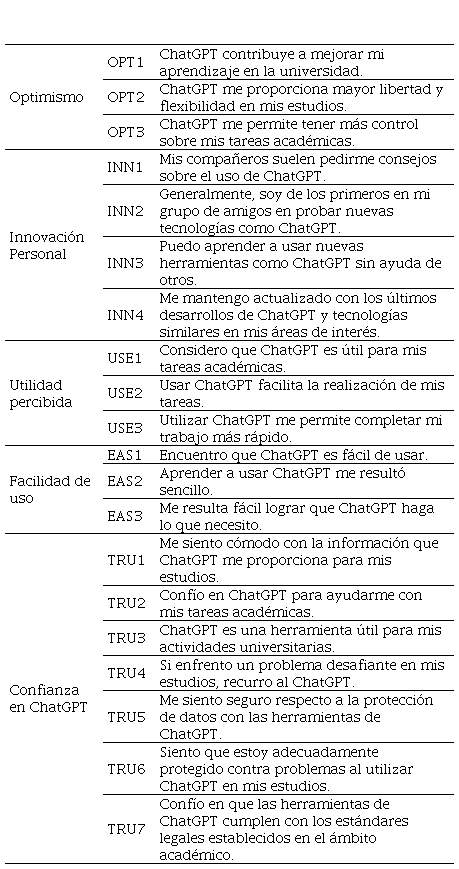 Asimismo, el cuestionario incluyó ítems para evaluar la facilidad de uso percibida y la confianza en herramientas de inteligencia artificial, utilizando escalas previamente validadas en estudios anteriores (Marimon et al., 2024). Se realizó un análisis factorial para confirmar la validez de los constructos, garantizando que cada ítem capturara con precisión la dimensión correspondiente dentro del marco teórico.
