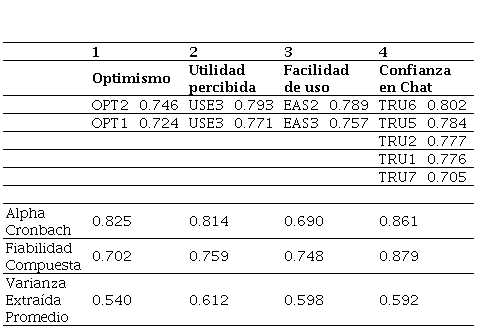 El segundo EFA, que examinó conjuntamente las dimensiones "Utilidad percibida" y "Facilidad de uso", reveló que dos ítems en cada dimensión presentaban cargas factoriales superiores a 0.7. Ambas dimensiones obtuvieron valores favorables en el alfa de Cronbach, lo que respaldó su fiabilidad y permitió su inclusión en el modelo final.