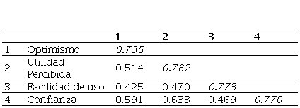 La Tabla 4 presenta los resultados del análisis de validez discriminante, el cual se llevó a cabo utilizando correlaciones lineales o covarianzas estandarizadas entre los factores latentes. Para evaluar la validez discriminante, se verificó que las correlaciones entre los constructos fueran menores que la raíz cuadrada de la AVE de cada uno de ellos (Fornell y Larcker, 1981).