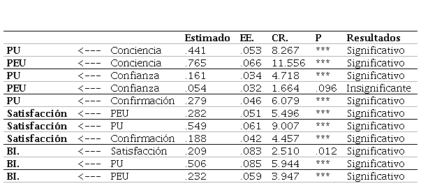 Los hallazgos confirman que la conciencia tuvo un efecto positivo y significativo tanto en la PU como en la PEU, con valores β = 0,441, p < 0,05 y β = 0,765, p < 0,05, respectivamente. Esto valida las hipótesis H1 y H2. Por otro lado, la confianza tuvo un efecto positivo y significativo en la PU (β = 0,161, p < 0,05), pero su impacto en la PEU no fue significativo (β = 0,054, p > 0,05). En consecuencia, H3 fue aceptada, mientras que H4 fue rechazada. Asimismo, la PEU mostró un efecto positivo sobre la satisfacción (β = 0,297, p < 0,05) y la BI (β = 0,232, p < 0,05), respaldando las hipótesis H5 y H6.