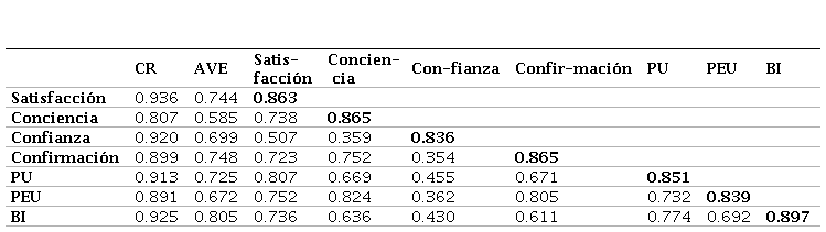 De manera similar, la PU influyó positivamente en la satisfacción (β = 0,549, p < 0,05) y en la BI (β = 0,506, p < 0,05), lo que confirma H7 y H8. Por otro lado, la confirmación tuvo un impacto positivo en la PU (β = 0,279, p < 0,05) y en la satisfacción (β = 0,188, p < 0,05), validando H9 y H10. Finalmente, la satisfacción mostró una influencia significativa en la BI (β = 0,209, p < 0,05), lo que permite aceptar H11. Los coeficientes de regresión correspondientes se presentan en la Tabla 4.
