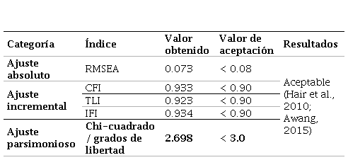 Para que la validez de constructo sea aceptable, todos los índices de ajuste deben cumplir con los valores sugeridos por investigadores como Awang (2015), además de que las cargas factoriales deben alcanzar un mínimo de 0,6. Como se muestra en la Tabla 2, todos los índices de ajuste cumplen y superan los valores recomendados en la literatura (Hair et al., 2010; Awang, 2015). Asimismo, las cargas factoriales de todos los ítems para cada constructo oscilaron entre 0,65 y 0,92, superando el umbral mínimo de 0,6 (Yusoff et al., 2021). Estos resultados confirman la validez de constructo del modelo.